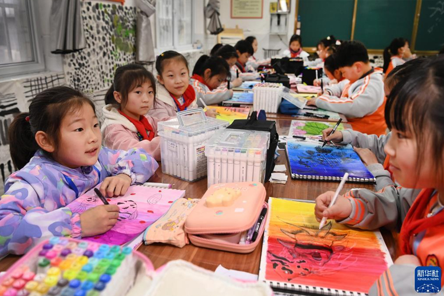 3月31日,嵐皋縣城關第二小學的學生在美術活動室繪畫。(新華社記者 陶明/攝)