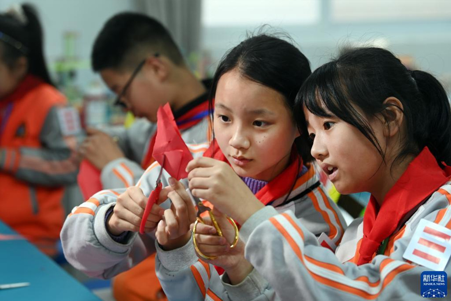 3月31日,嵐皋縣城關第二小學的學生在校園活動室進行剪紙創作。(新華社記者 陶明/攝)