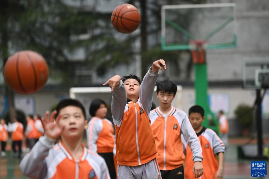 3月31日,嵐皋縣城關第二小學的學生在校園里進行籃球訓練。(新華社記者 陶明/攝)