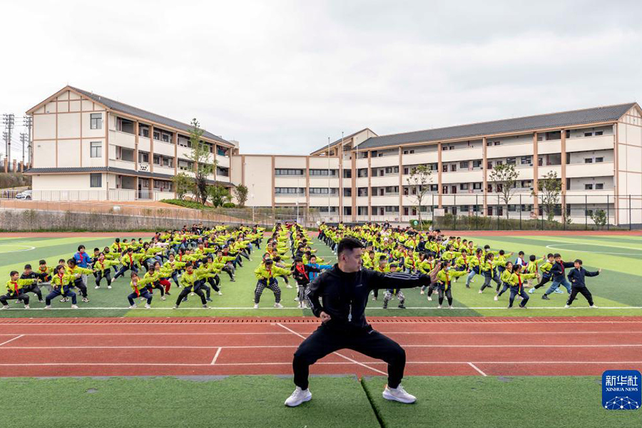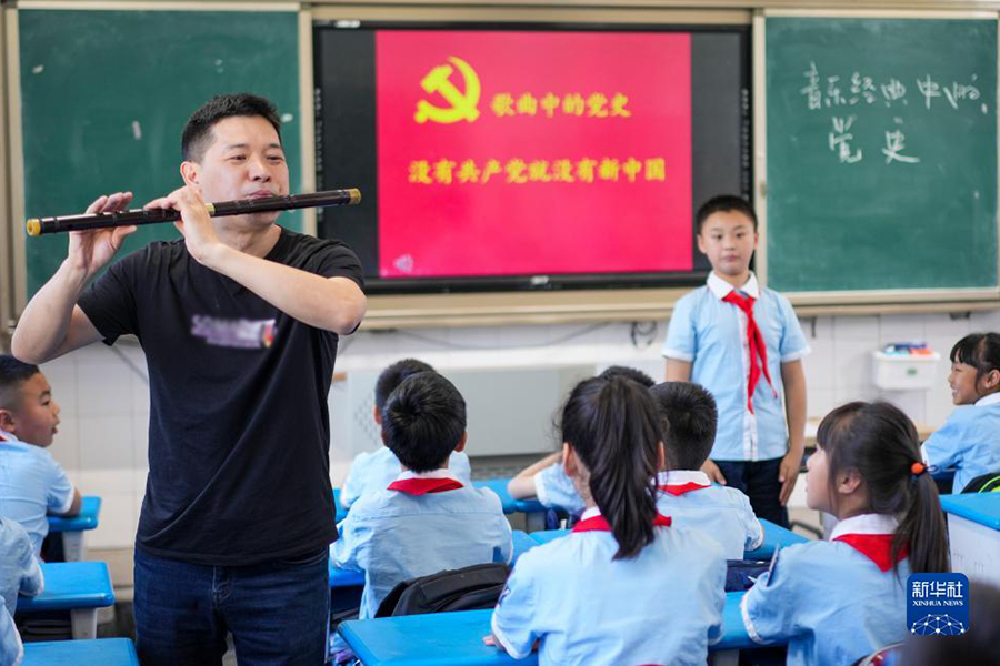 5月5日,在重慶市九龍坡區鐵路小學五年級一班的課堂上,音樂老師為學生們吹奏紅色經典樂曲《沒有共產黨就沒有新中國》。(新華社記者 劉潺/攝)