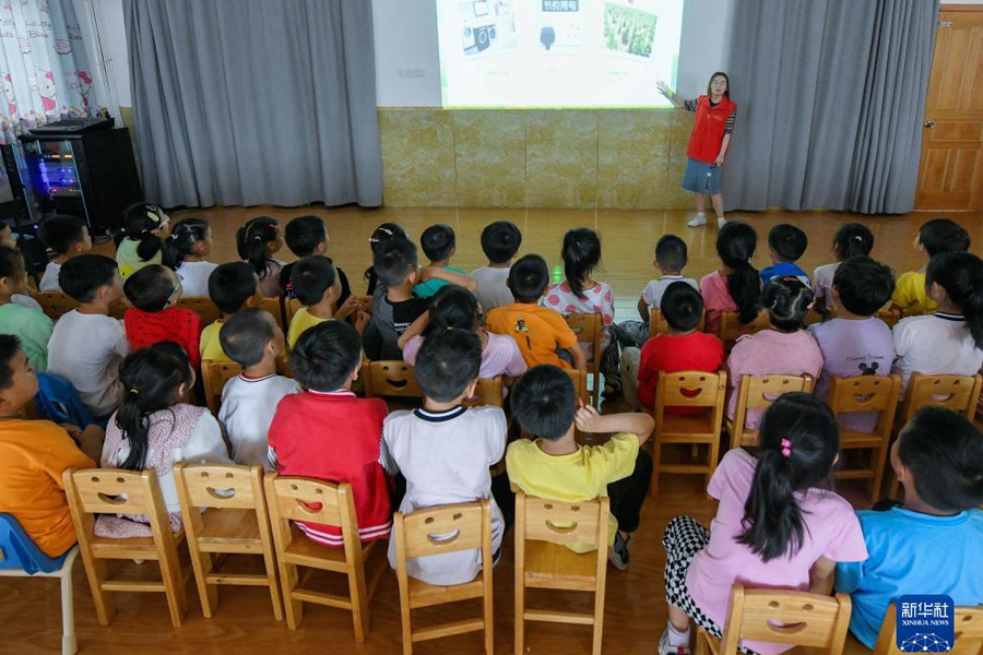 6月23日,在浙江省湖州市德清縣莫干山鎮中心學校,民警向學生講解毒品危害。當日,不少學校開展禁毒教育,增強學生識毒、防毒、拒毒的意識和能力。(新華社發 謝尚國/攝)