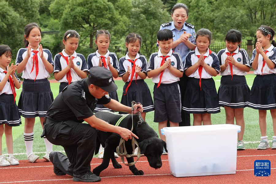 6月23日,浙江省湖州市德清縣公安局在莫干山鎮中心學校舉辦的禁毒主題宣傳活動上,一只緝毒犬進行嗅毒表演。(新華社發 謝尚國/攝)