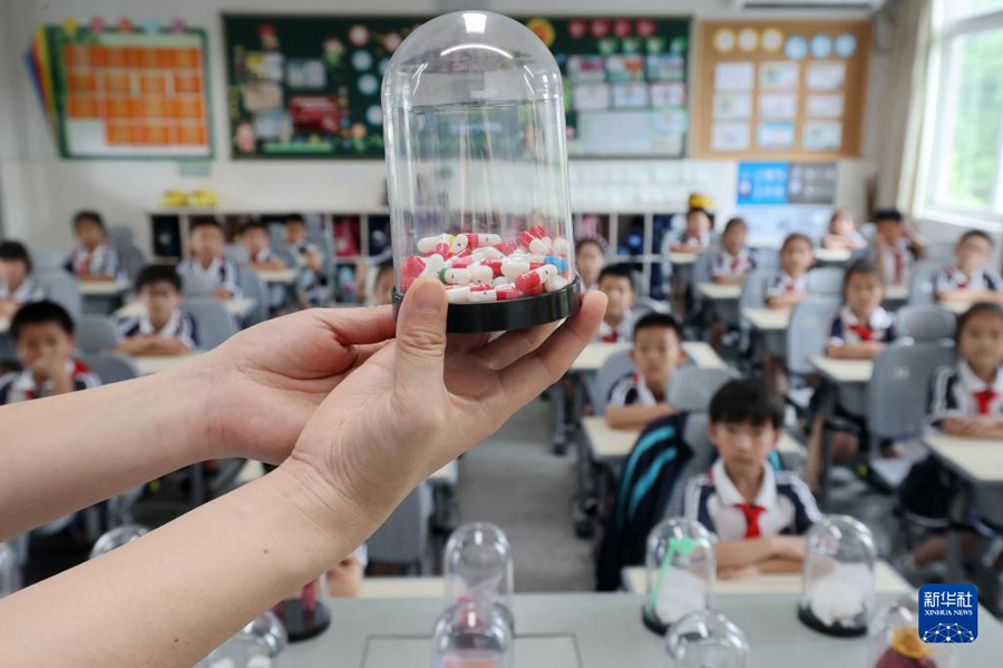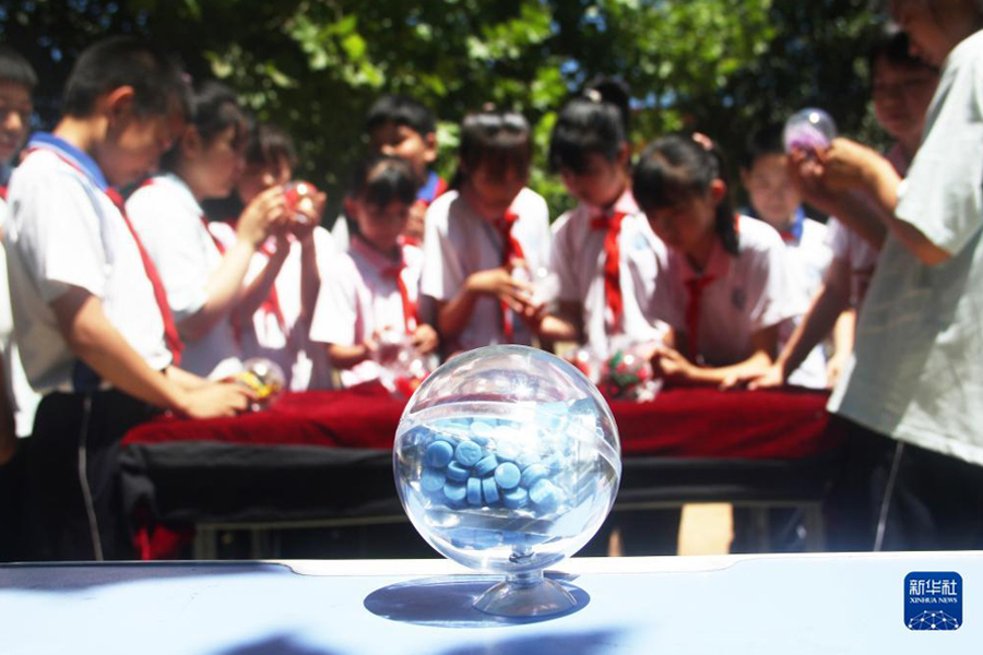 6月23日,河北省唐山市豐潤區姜家營鄉楊家鋪小學學生在分辨仿真毒品樣本。(新華社發 朱大勇/攝)
