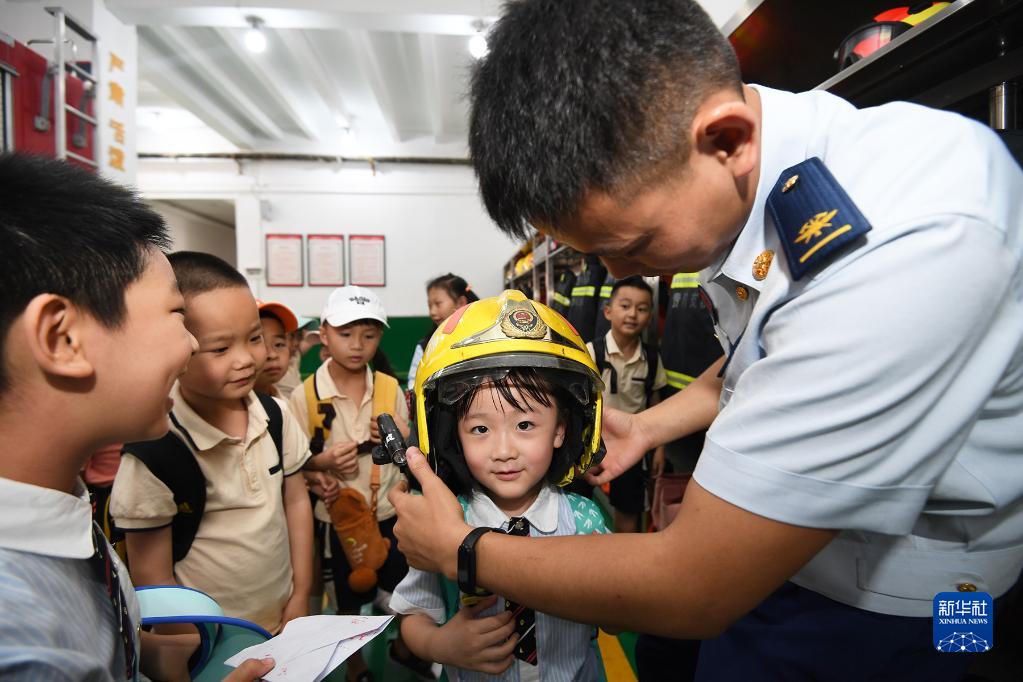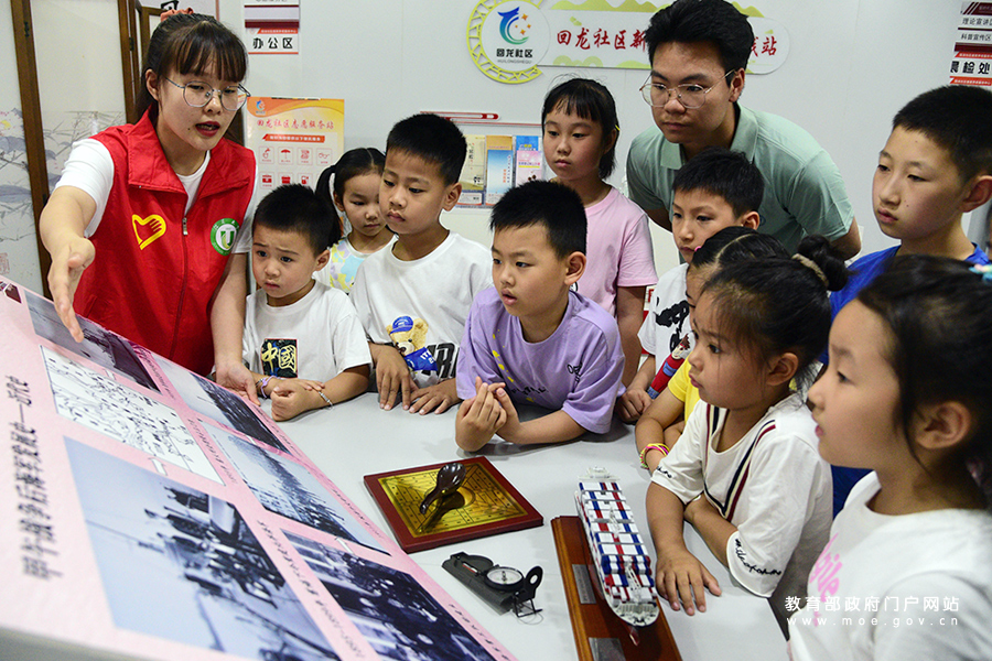 2022年7月9日,在江蘇省鎮江市回龍社區,志愿者在向小朋友講解我國的航海史。(石玉成/攝)