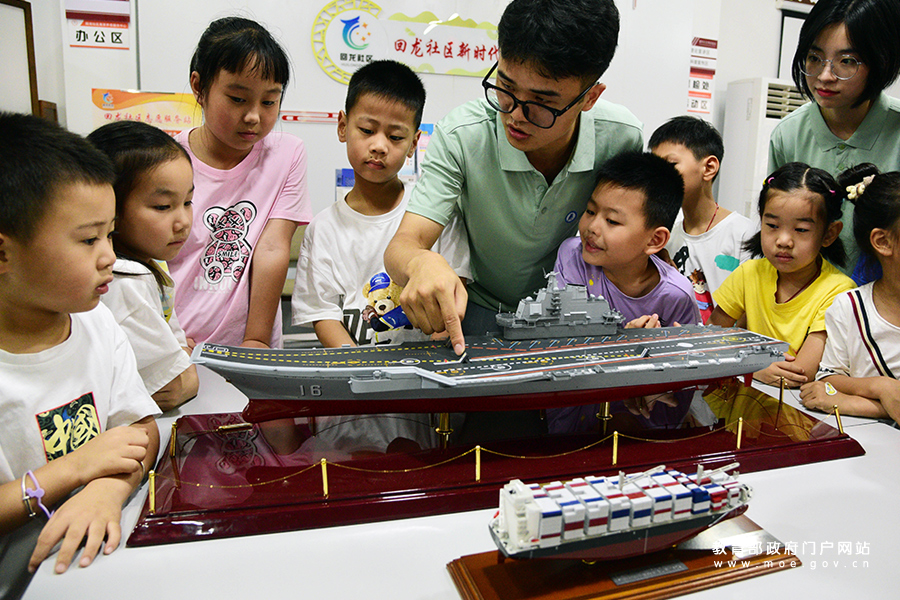 2022年7月9日,在江蘇省鎮江市回龍社區,志愿者在指導小朋友拼裝艦船模型。當日,江蘇科技大學和江蘇大學志愿者走進鎮江市南山街道回龍社區,向孩子們介紹我國的航海史及現代海防科普知識,迎接7月11日中國航海日。(石玉成/攝)