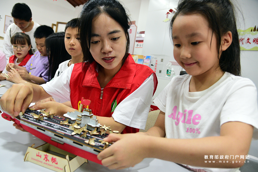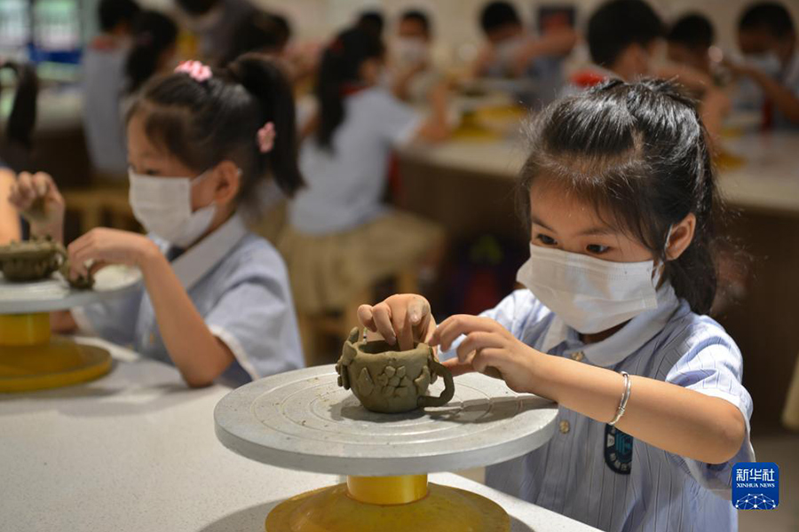 7月11日,河北省石家莊市柏林莊學校暑假托管班的小學生做陶藝。(新華社發 閆志國/攝)