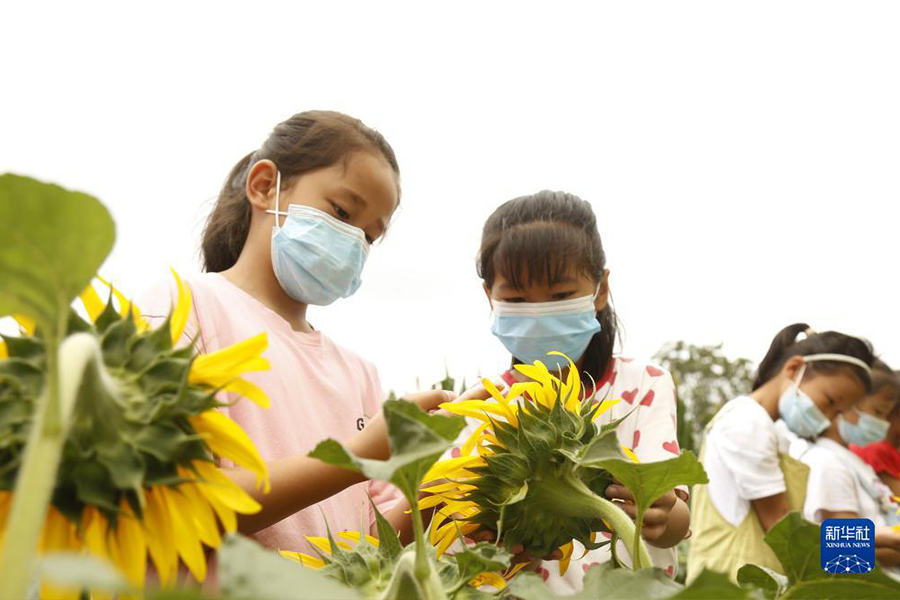 7月12日,在河北省邢臺市南康莊小學勞動教育實踐基地,參加暑期活動的孩子們觀察農作物生長情況。(新華社發 張馳/攝)