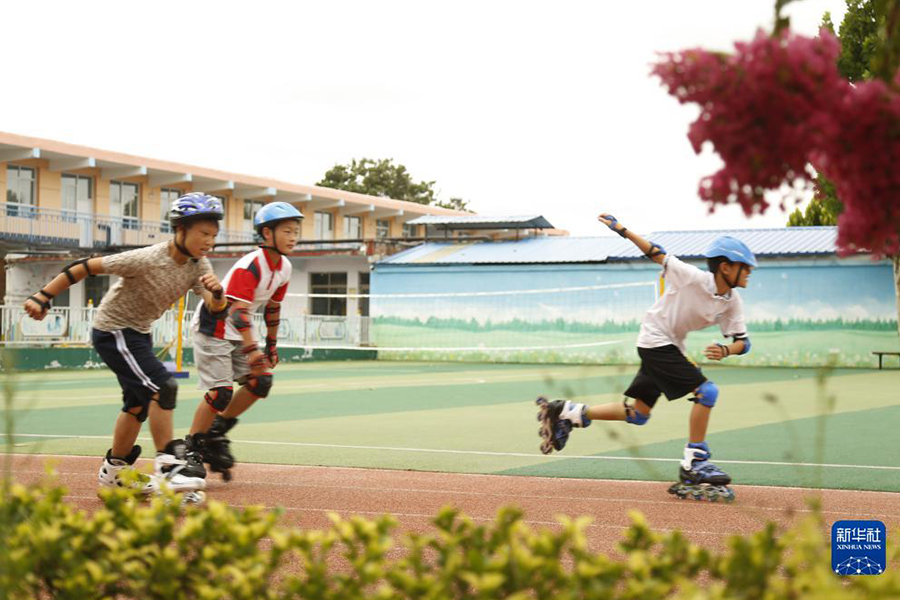 7月12日,在河北省邢臺市南康莊小學,參加暑期活動的孩子們練習輪滑。(新華社發 張馳/攝)