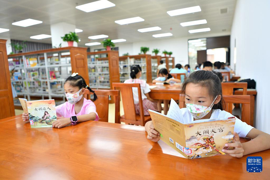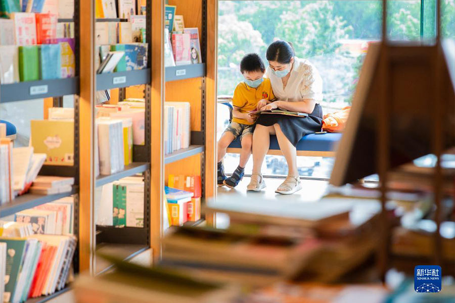 7月17日,家長陪伴孩子在南京一家書店內閱讀。(新華社發 蘇陽/攝)
