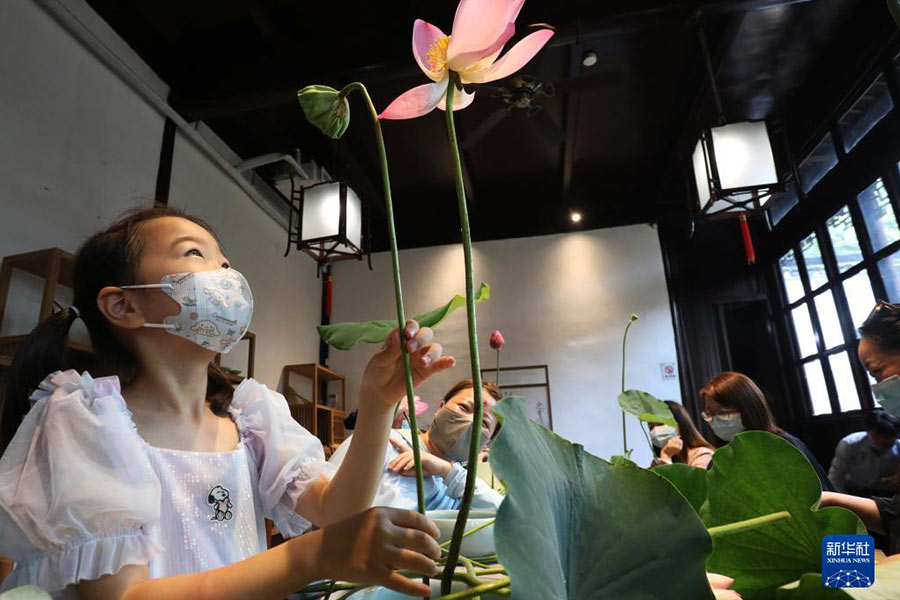7月17日,在江蘇蘇州古典園林拙政園,一名小朋友在家長陪同下體驗夏荷插花。(新華社發 杭興微/攝)