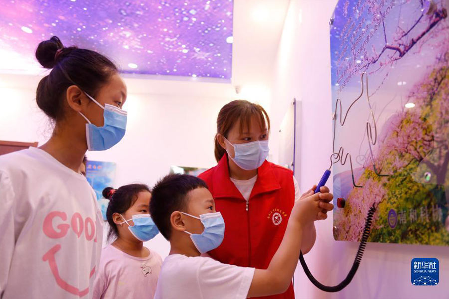 7月17日,在河北省邢臺市南和區和陽鎮和韻社區人文公共空間,文明實踐志愿者為孩子們講解科普知識。(新華社發 張馳/攝)