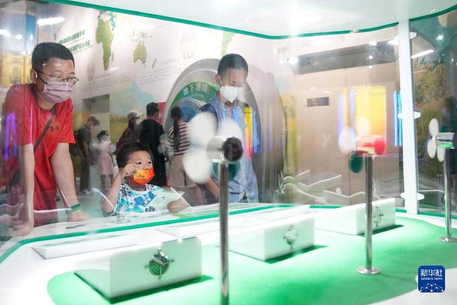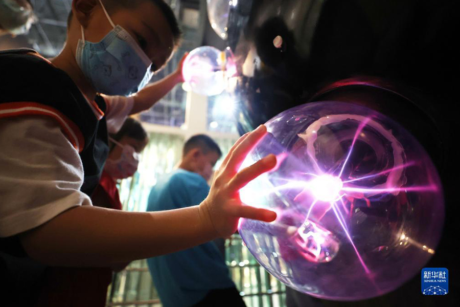 8月14日,在中國科學技術館,學生在參觀名為“光伏板的進化”裝置。(新華社記者 鞠煥宗/攝)