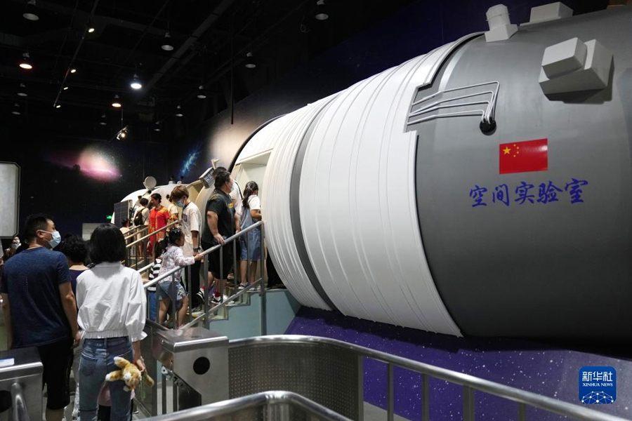 8月14日,在中國科學技術館,參觀者排隊參觀神舟飛船和空間實驗室大型仿真模型。(新華社記者 鞠煥宗/攝)