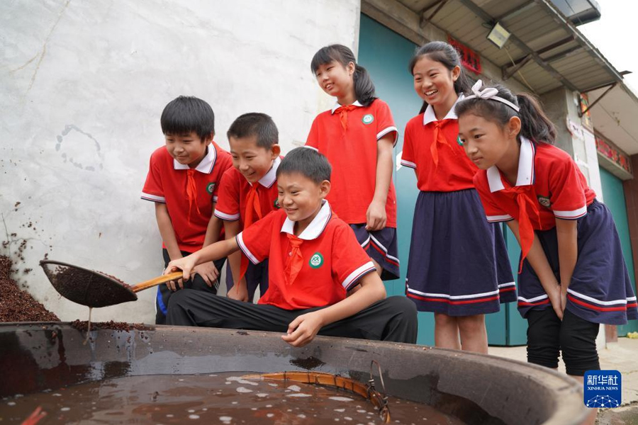 8月27日,河北省邢臺市內丘縣柳林鎮明德小學學生在體驗酸棗仁加工技藝。(新華社發 劉繼東/攝)