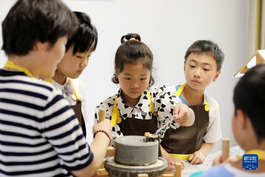 8月27日,在山東省臨沂市郯城縣郯城街道龍泉社區黨群服務中心,社區居民教孩子們使用石磨。(新華社發 張春雷/攝)