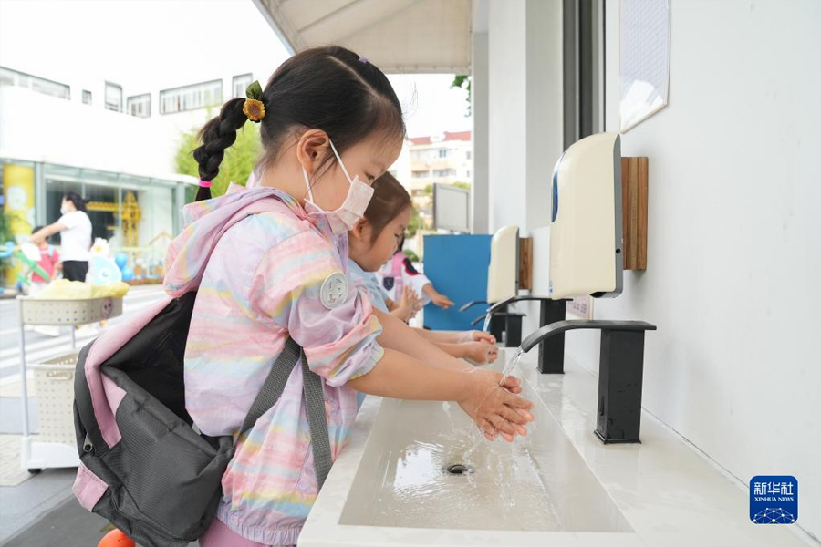 9月1日,在上海市徐匯區科技幼兒園,孩子們在水池前洗手。(新華社記者 丁汀/攝)