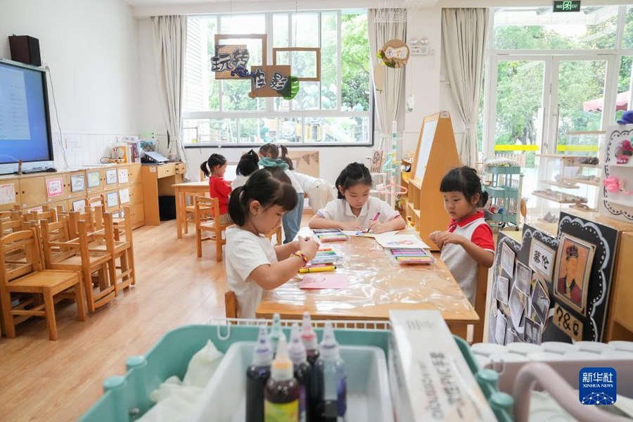 9月1日,在上海市徐匯區科技幼兒園,孩子們在教室內畫畫。(新華社記者 丁汀/攝)