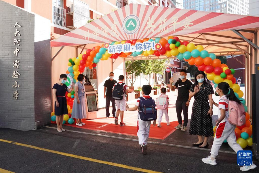 9月1日,北京人大附中實驗小學學生進入校園。(新華社記者 任超/攝)