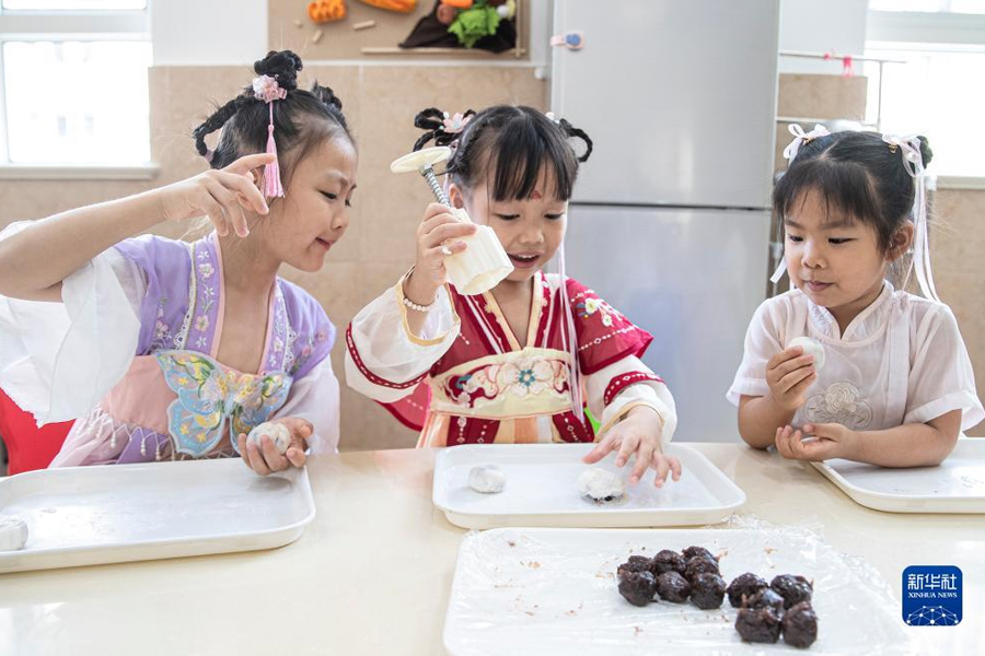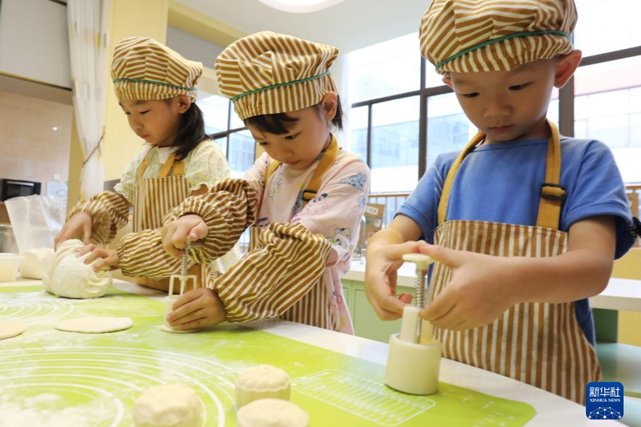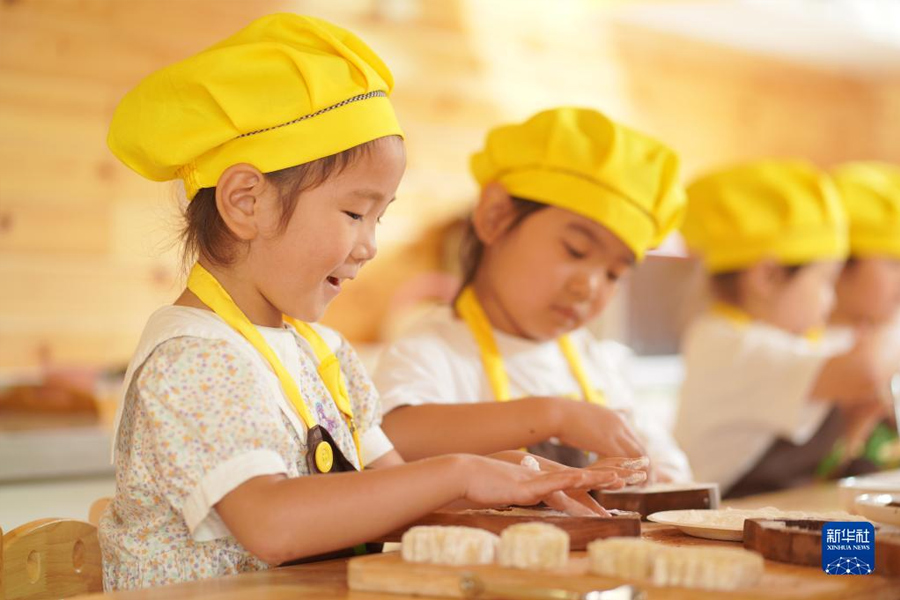 9月8日,河南省洛陽市河柴幼兒園的小朋友在體驗制作手工月餅。(新華社發 黃政偉/攝)