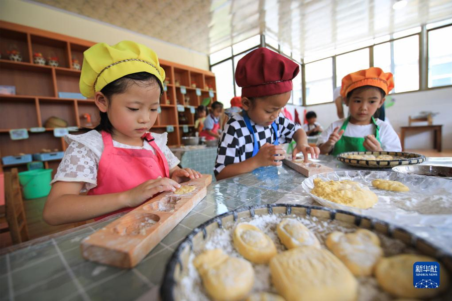 9月8日,北京門頭溝妙峰山民族學校附屬幼兒園的孩子們在制作月餅。中秋佳節即將到來之際,各地幼兒園紛紛開展豐富多彩的活動,迎接中秋節的到來。(新華社發 侯繼慶/攝)