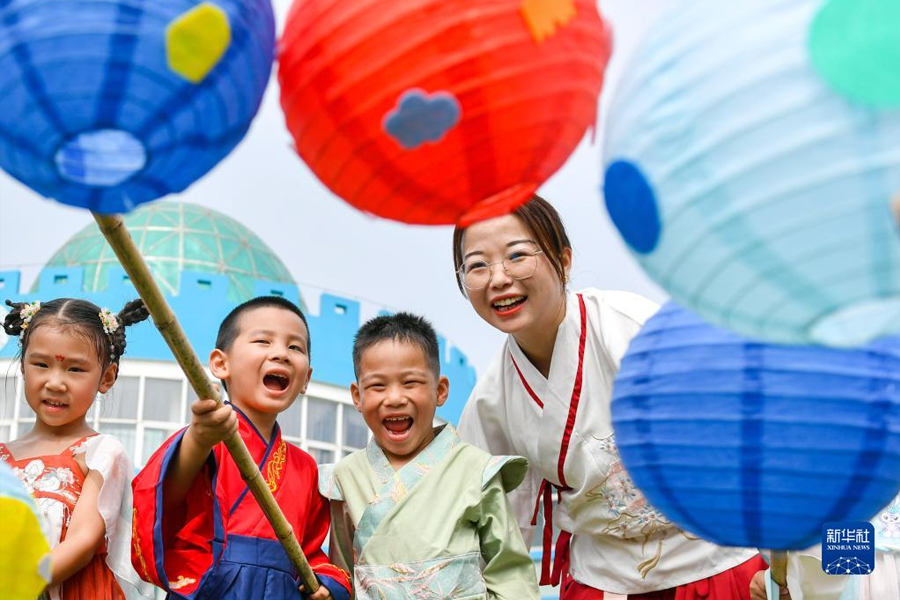9月8日,浙江省湖州市長興縣煤山鎮中心幼兒園的師生一起進行竹竿挑燈游戲。(新華社發 譚云俸/攝)