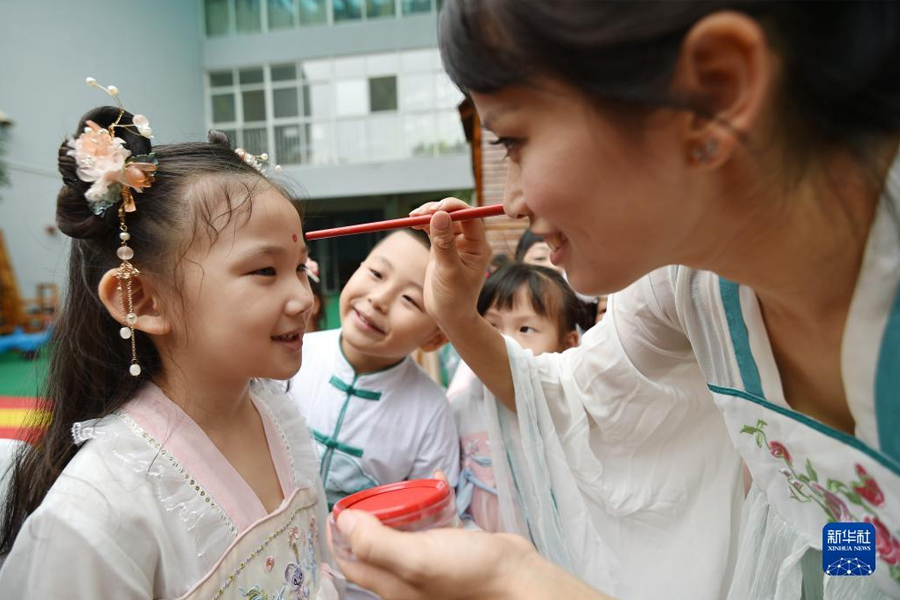 9月8日,江蘇省南京市建鄴區金地名京幼兒園的老師為小朋友點朱砂。(新華社發 方東旭/攝)