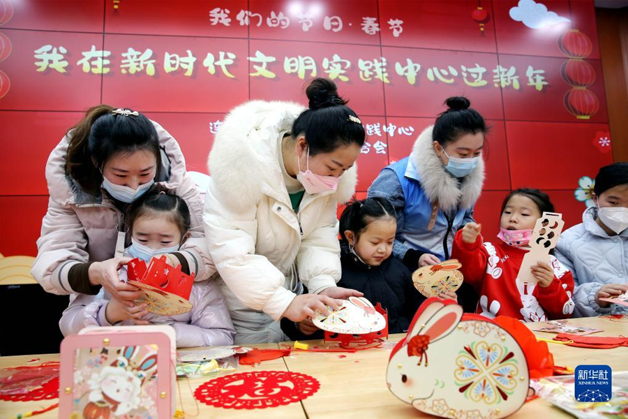 1月13日,在江蘇省連云港市開展的“我在新時代文明實踐中心過新年”活動中,孩子們在學習拼裝兔子花燈。(新華社發 朱華南/ 攝)