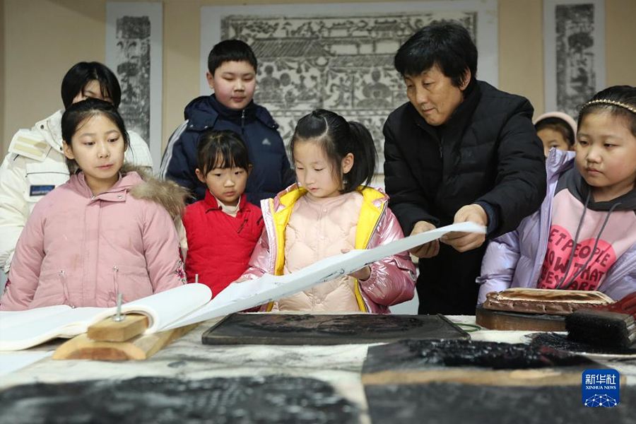 1月13日,在山東省臨沂市沂南縣博物館,木版年畫傳承人(右二)給孩子們講授木版年畫制作技藝。(新華社發 王彥冰/ 攝)