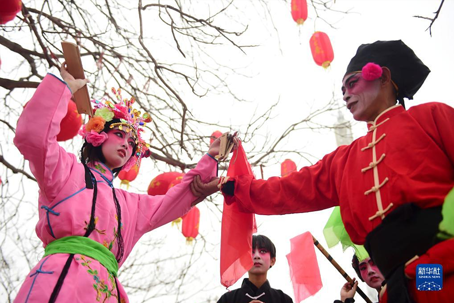 1月13日,河北省滄州市滄縣感化屯村滄州落子老藝人蔣松林(右一)向孩子們傳授滄州落子表演的基本動作。(新華社發 傅新春/ 攝)