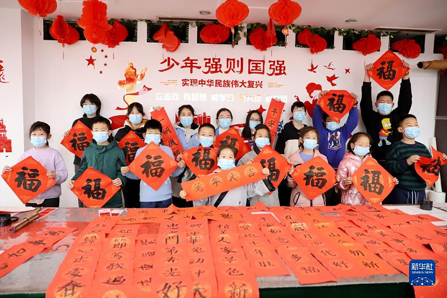 1月13日,山東省青島西海岸新區青少年展示書寫的春聯。(新華社發 王培珂/ 攝)