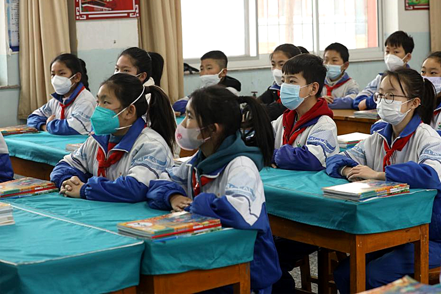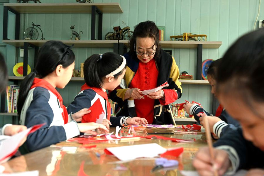 2月28日,國家級非遺蔚縣剪紙代表性傳承人在石家莊市東風小學非遺工坊給學生傳授剪紙技藝。(新華社發 陳其保/攝)