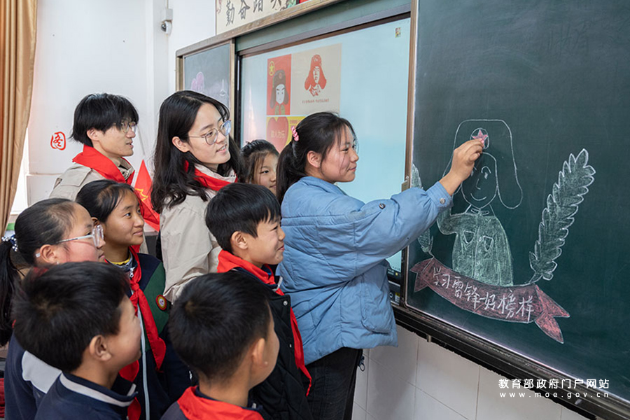3月2日,在涼山彝族自治州甘洛縣普昌鎮橋邊小學,四川大學研究生支教團的老師們為學生們上“學雷鋒”主題繪畫課。(劉勇、齊有明/文 陽恒/攝)