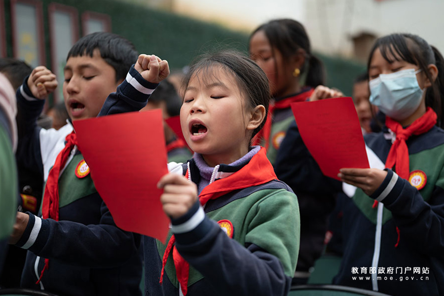 3月2日,在涼山彝族自治州甘洛縣普昌鎮橋邊小學,學生們面向國旗進行“學雷鋒”主題宣誓。(劉勇、齊有明/文 陽恒/攝)