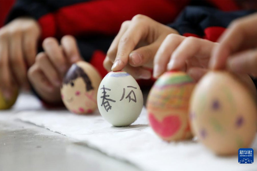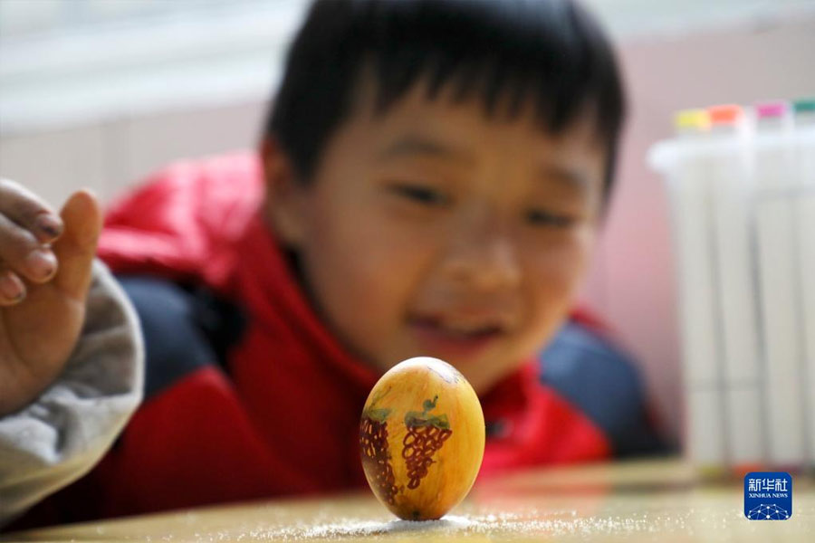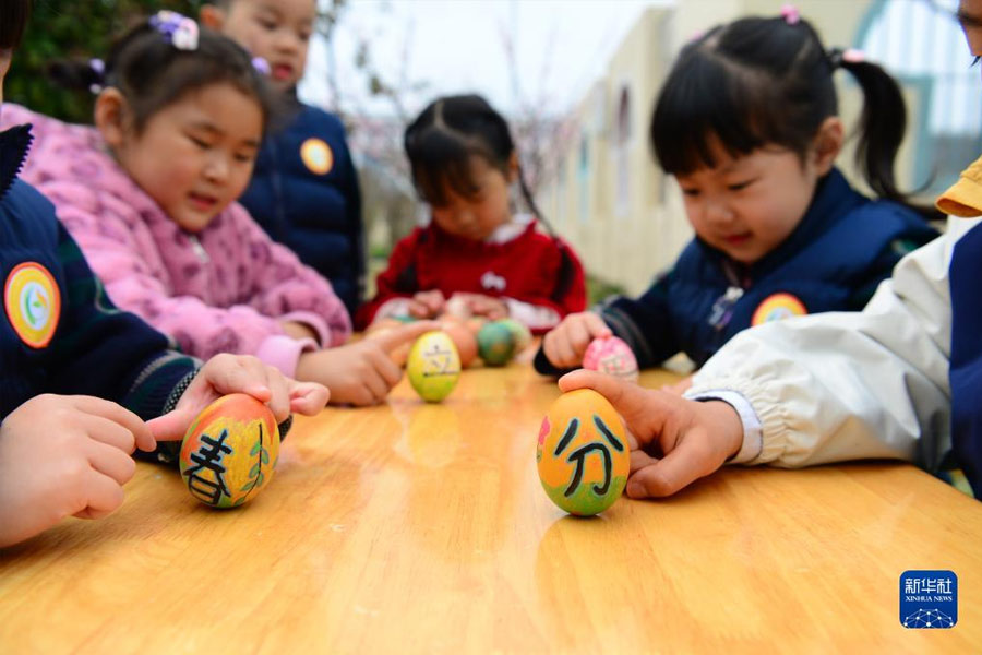 3月20日,江蘇省無錫市陽山中心幼兒園的小朋友在玩“立蛋”游戲。(新華社發 還月亮/攝)