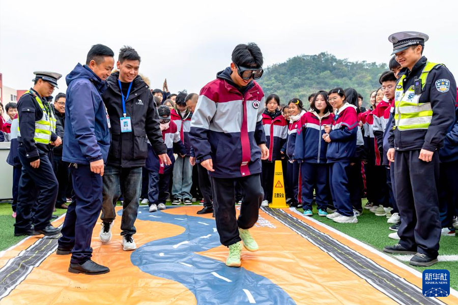 12月1日,在貴州省黔西第一中學,學生體驗酒駕感覺,了解酒駕的危害。(新華社發 范暉/攝)