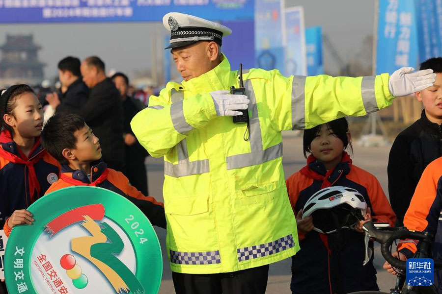 12月1日,山東省濱州市陽信縣交警為小學生講解交通安全知識。(新華社發 霍向鋒/攝)