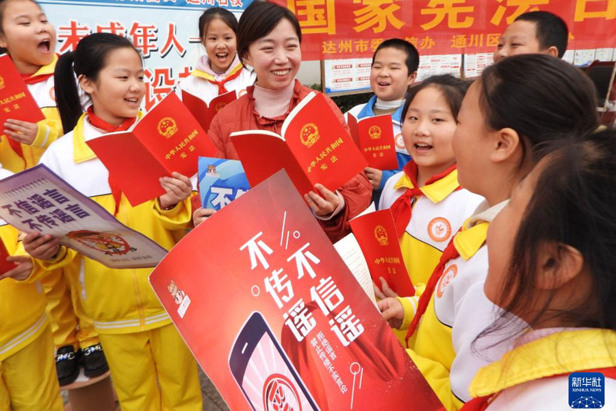 12月3日,在四川省達州市通川區羅江鎮魏興實驗學校,普法志愿者給學生講解憲法知識。(新華社發 鄧良奎/攝)