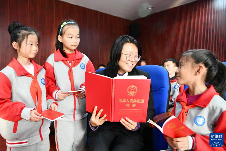 12月3日,在山東青島壽光路小學開展的憲法知識進校園活動上,法官在指導學生學習憲法知識。(新華社發 王海濱/攝)