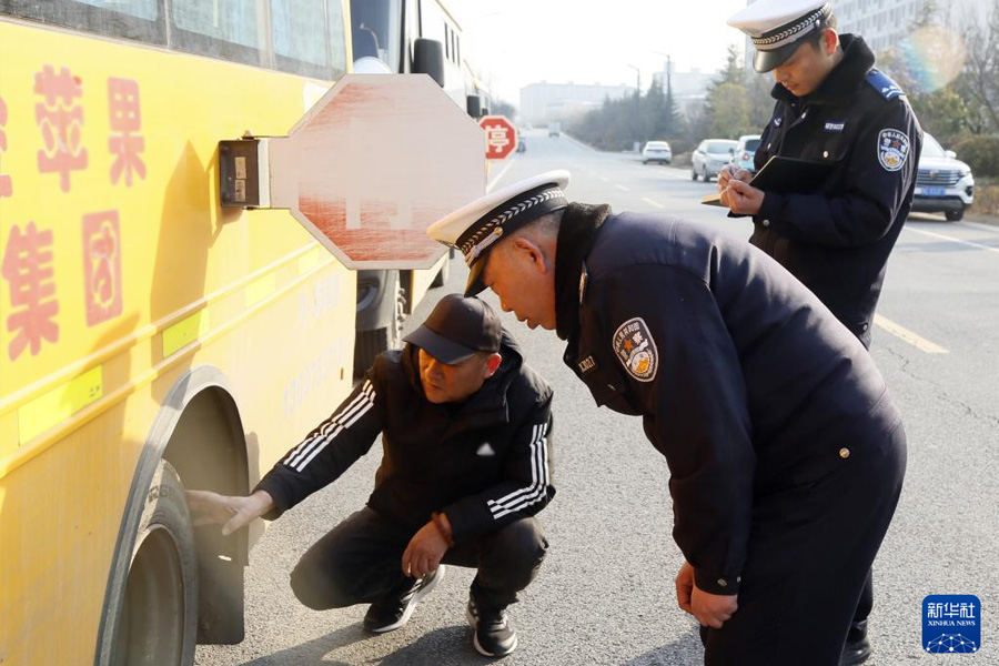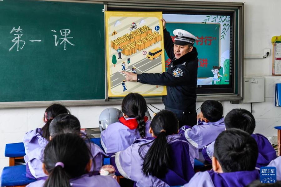 2月13日,河北省遵化市公安局交通警察大隊的民警在遵化市第六實驗小學向學生講解交通安全知識。(新華社發 劉滿倉/攝)
