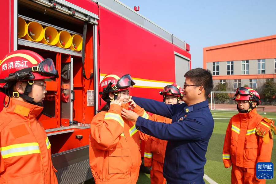 2月13日,在江蘇省句容市葛村中心小學,學生在消防員的幫助下體驗穿戴消防救援服。(新華社發 鐘學滿/攝)