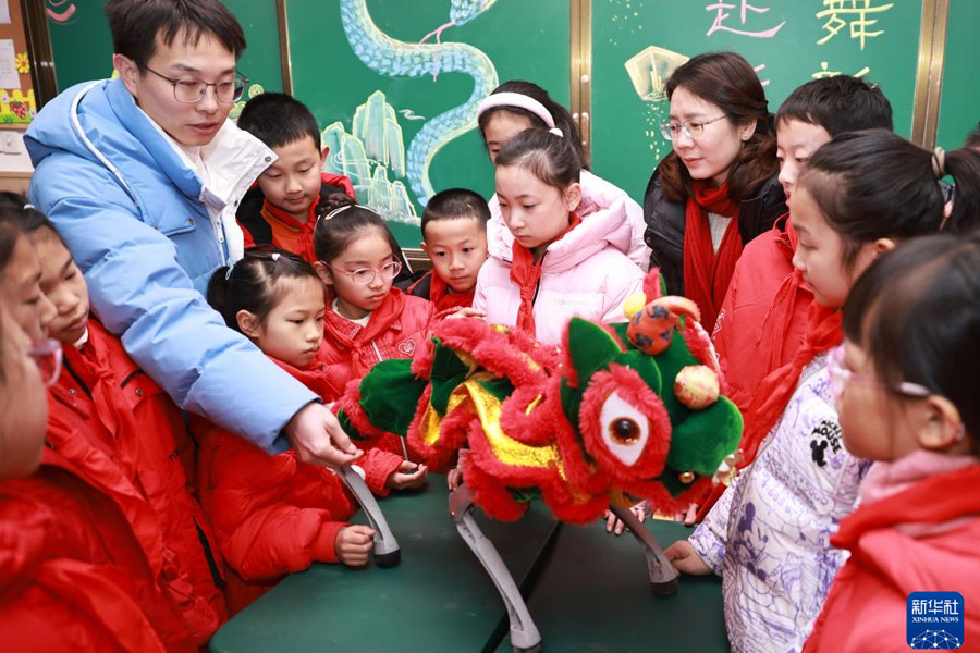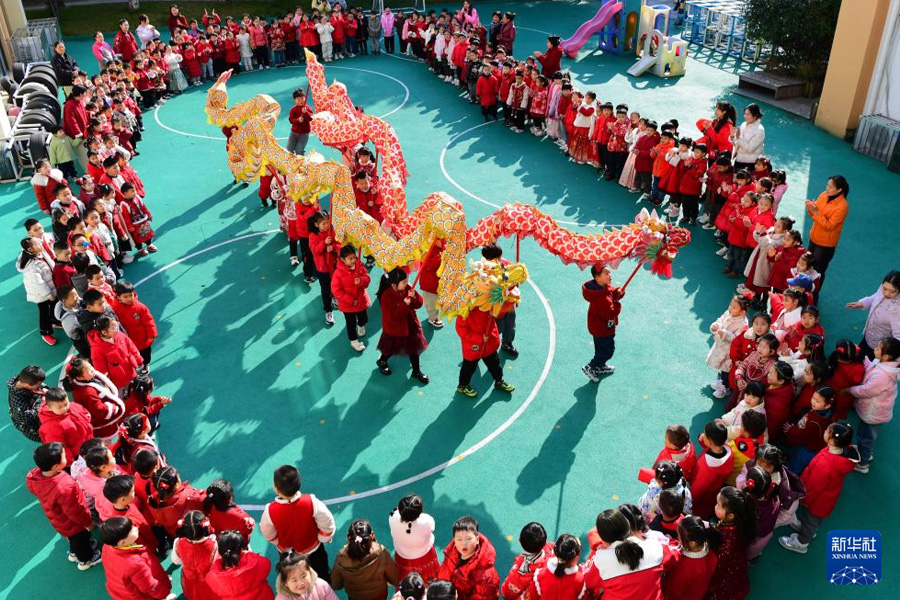 2月13日,江蘇省無錫市梁溪區崇安中心幼兒園的小朋友在體驗舞龍。(新華社發 還月亮/攝)