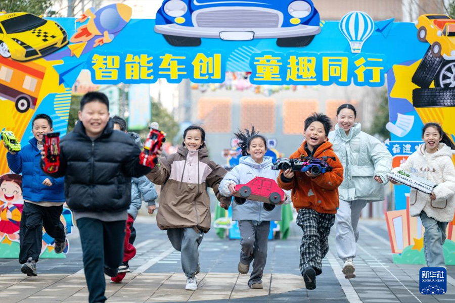 2月13日,在浙江省湖州市長興縣實驗小學(龍山校區),學生參加“智能車創 童趣同行”開學季活動。(新華社發 譚云俸/攝)