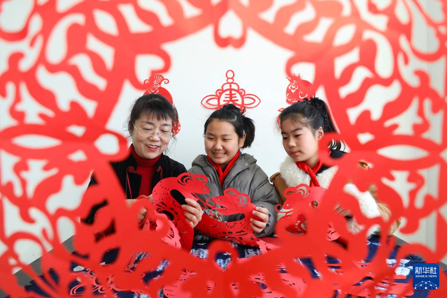 2月13日,在河北省唐山市豐潤區火石營鎮黃昏峪小學舉行的“非遺進校園”開學第一課主題活動中,剪紙藝人葛英(左一)向學生傳授剪紙技藝。(新華社發 朱大勇/攝)