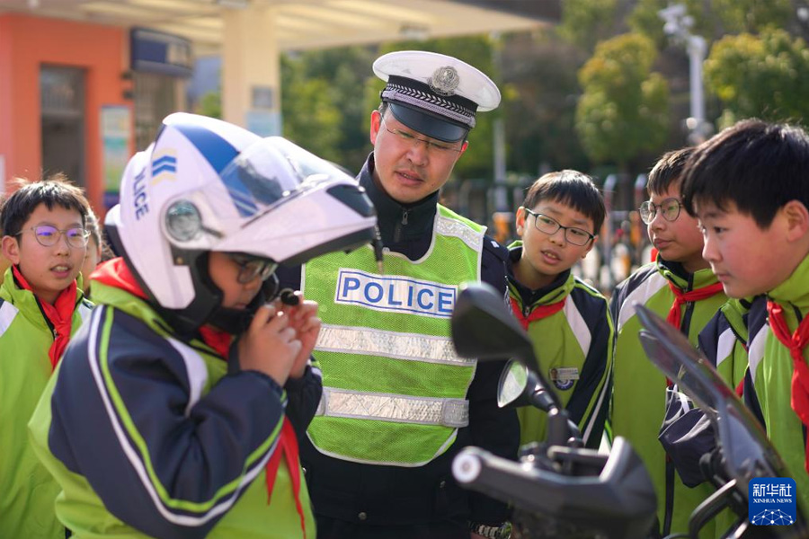 2月13日,浙江省岱山縣公安局交通警察大隊輔警在轄區高亭小學向學生講解如何正確佩戴安全頭盔。(新華社發 鄒訓永/攝)