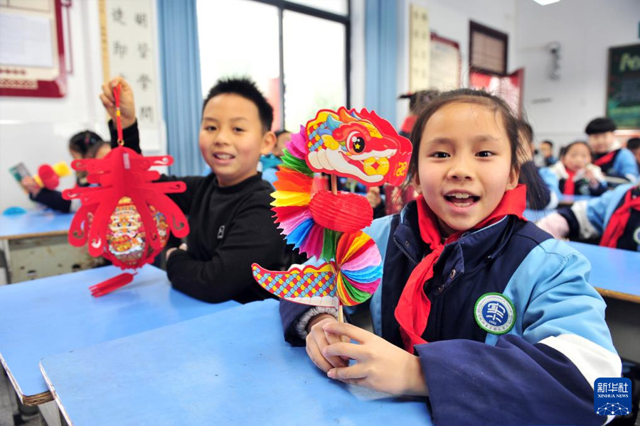 2月13日,湖北省宜昌市秭歸縣實驗小學學生在“開學第一課”上展示自己寒假期間精心創作的手工作品。(新華社發 王輝富/攝)