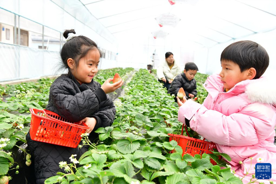 2月13日,浙江省建德市楊村橋中心小學學生在校園“農博園”里采摘草莓。(新華社發 寧文武/攝)