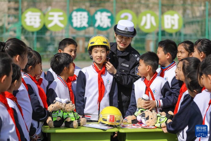3月28日,在山東青島王埠小學,青島交警李滄大隊輔警教學生如何正確佩戴頭盔。(新華社發 張鷹/攝)