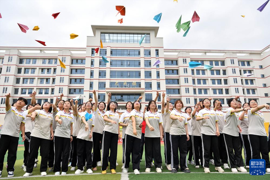 6月3日,在湖北省襄陽市??悼h第一中學,高三學生在操場上放飛寫有自己心愿的紙飛機。(新華社發 楊韜/攝)