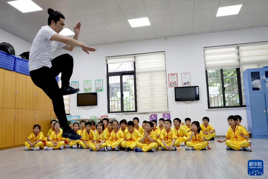 7月7日,教練在上海黃浦區老西門街道的愛心暑托班上向小學員們展示武術動作。暑假來臨,各地學生通過形式多樣的活動,豐富假期生活,樂享時光。(新華社記者 方喆/攝)