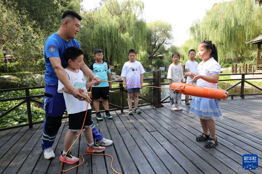 7月25日,在山東省濱州市博興縣城東街道東城社區,博興縣“9958”應急救援隊志愿者指導小朋友使用救生圈演練溺水自救互救基本技能。(新華社發 陳彬/攝)